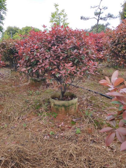 產品優勢: 目前我國園林綠化中常綠或半常綠的紅葉樹種極少,常見的有紅花檵木和紅葉小檗,但這兩個樹種的葉片革質化程度低,耐寒性比紅葉石楠差;紅花檵木僅適宜在酸性土壤種植,紅葉小檗雖然對土壤適應性較強,但其為半常綠或落葉樹種,且兩個樹種的葉片均為暗紫紅色,無論是生態適應性還是葉片觀賞性,都無法與紅葉石楠的鮮亮紅色相媲美。