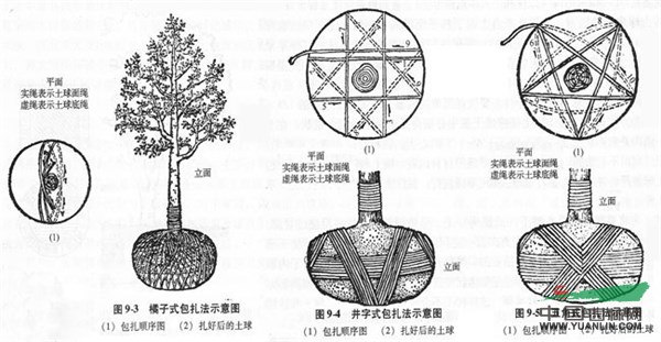 關于土球包扎的方式,市面上有很多種,如橘子法、井字法、五角星法等,如下圖所示,