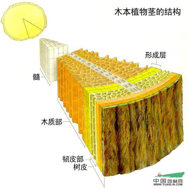 在處理土球的過程當中,這是一個非常重要的節點。為什么要提到這個方面?因為很多時候樹木死亡是由于沒有導出根系,而沒有新生根最主要的原因就是根系撕裂后沒有地方生長。要知道,新生根長的地方是在韌皮部和木質部中間的這個形成層位置,如下圖,